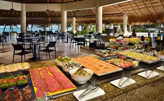 Restaurante buffet ao ar livre, localizado junto à praia, com cozinha internacional requintada.