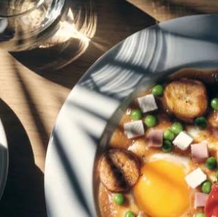 Um restaurante à la carte com especialidades mediterrâneas com uma temporada de entradas e mezze da Costa Mediterrânea e pratos principais como frango ou res kebab ou paella cega com camarão.