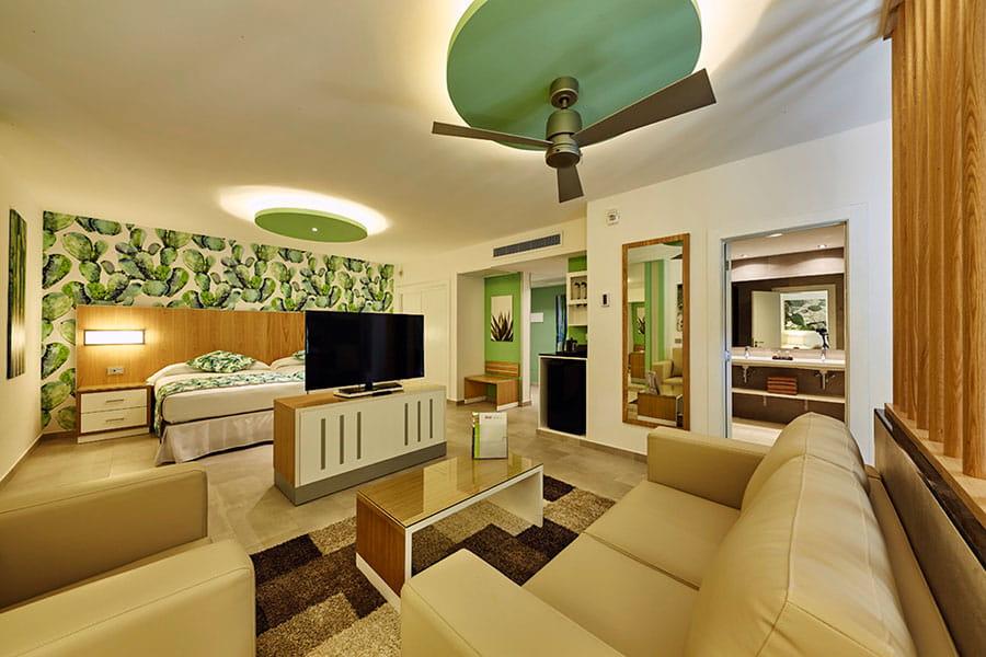 Os quartos Júnior Suite do Hotel Riu Tequila disponibilizam-lhe os melhores serviços para que possa desfrutar ao máximo da sua estadia. Nestes quartos de 54 m2 encontrará uma cama de 200x200 cm ou 2 camas de 125x200 cm, sofá na sala de estar, TV por satélite, ar condicionado, mini bar, distribuidores de bebidas e varanda ou terraço para desfrutar dos arredores do hotel.