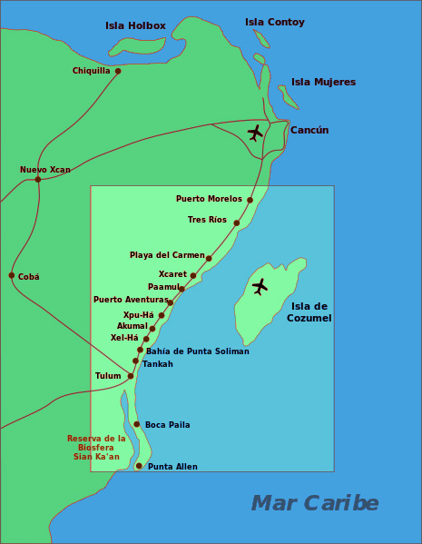 A Riviera Maya é uma região banhada pelo Mar do Caribe, localizada no estado de Quintana Roo no México. Geograficamente, estende-se ao longo do litoral por 130 km, desde a localidade de Puerto Morelos a norte, até à localidade de Punta Allen no sul.